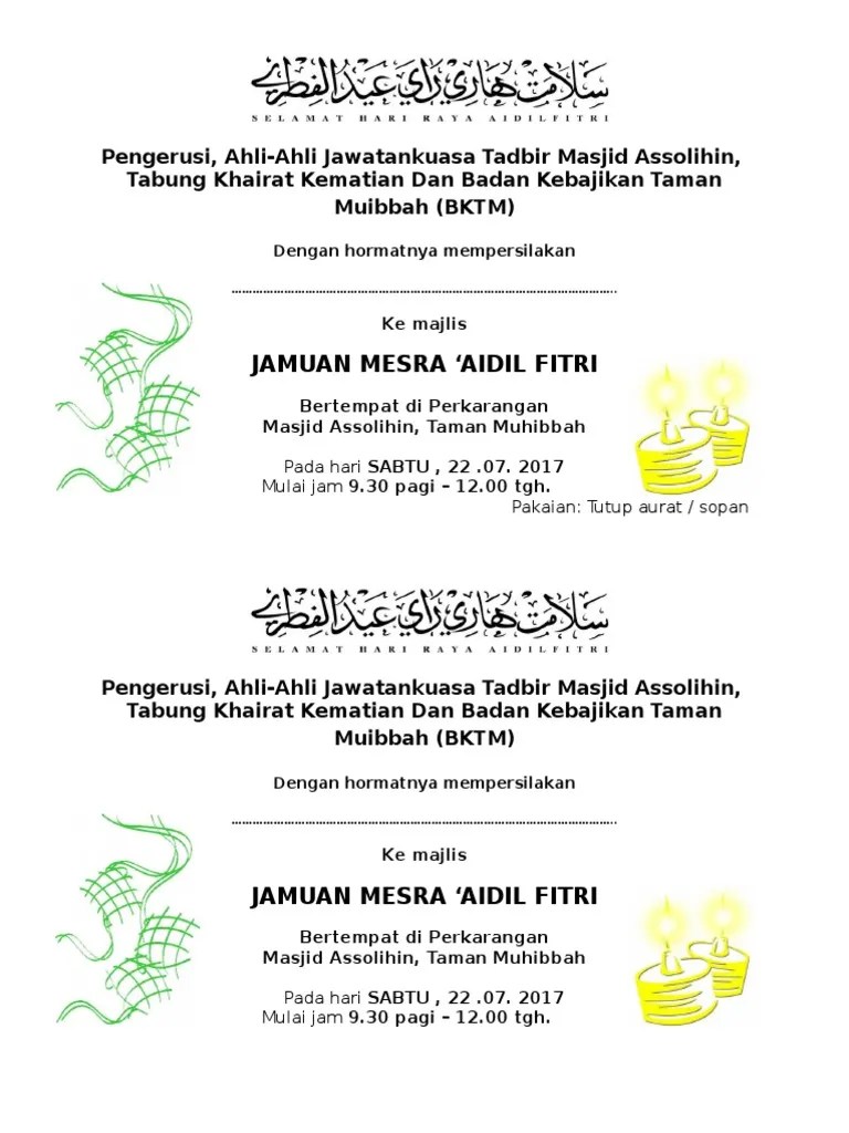 Jemputan Jamuan Hari Raya : Jemputan Ke Jamuan Hari Raya Isma Cawangan Kuala Terengganu Isma Kuala Terengganu. Dato' zaman azam bin mohamat sarif@ahmat, pegawai daerah bera telah melawat sekatan jalan raya di sekitar daerah bera. Kumpulan contoh muqoddimah mukadimah pembukaan ceramah, pidato, mc, pengajian, khutbah jumat, pernikahan terbaik bahasa arab latin arti ayat … 12.11.2012 · dalam konteks ruang awam, sebagai contoh majlis perkahwinan etnik melayu dan jamuan hari raya turut dihadiri oleh masyarakat pelbagai etnik. Pesta ini merupakan cuti umum di sarawak dan majlis keagamaan dan sosial yang diiktiraf sejak 1957.